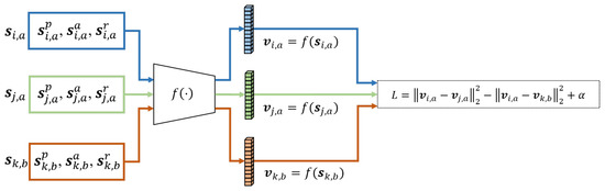 Let and () be two unit steps of the subject for a sensing modality m, and let be a unit step of subject for a sensing modality m. The model takes three types of unit steps: pressure, acceleration, and rotation. For brevity, however, we use the simplified notation instead of . Similar to the triplet loss [21], the multimodal triplet loss is defined as