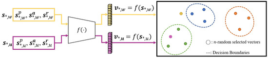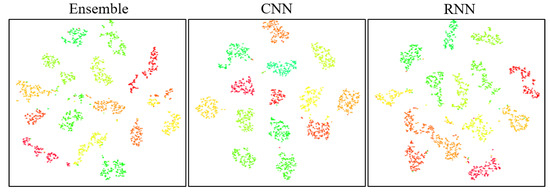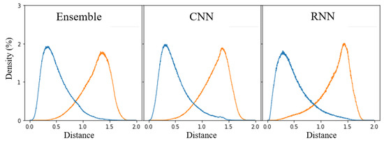 We take the last fully connected layer with 128 units of the CNN and RNN as the output of each network model. Therefore, the dimensions of the embedding vectors of CNN and RNN are identical to 128, that is . The embedding vector of the ensemble model is generated by concatenating the embedding vectors of CNN and RNN; hence, the dimension is 256, that is . All embedding vectors are normalized, that is .