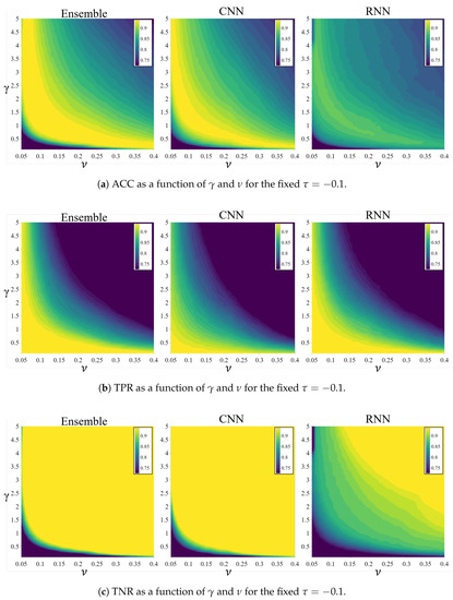 Comparison of the ACC, TPR, and TNR results as a function of and for the ensemble, convolutional neural network (CNN), and recurrent neural network (RNN). The same color denotes a similar rate (maximum 1% difference), with yellow indicating the highest rates.