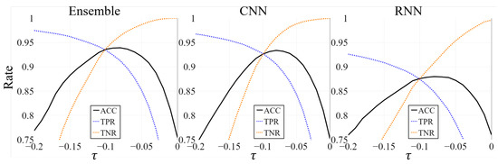 To determine the effect of , we specified separate values of and for the different models in the following experiment. We used and for the ensemble model, and for the CNN model, and and for the RNN model. In Figure 7, we see that choosing a value smaller than 0 significantly improves the TPR and ACC. Based thereupon, we propose alternative options for choosing instead of for the decision boundary in the latent space.