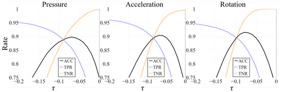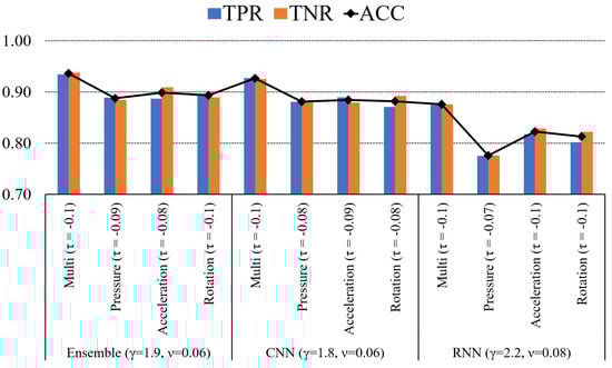 To determine the contribution of each sensing modality to the accuracy, we trained and tested the models using uni-modal sensing. Effectively, in each sensing modality, only the corresponding sub-network was activated, whereas the two other sub-networks were deactivated while the network was being trained and tested. The TPR, TNR, and ACC of the uni-modal ensemble model as function of are compared in Figure 8. The overall performance of the ensemble model using pressure sensing was slightly lower than that of the others.