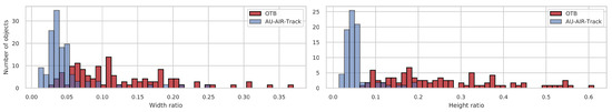 Distribution of bounding box sizes w.r.t. their image resolution. A comparison between the Online Tracking Benchmark (OTB) [4] in red (ground-level perspective), and the AU-AIR-Track dataset in blue (unmanned aerial vehicle (UAV) perspective). A detailed description of our dataset AU-AIR-Track is given in Section 4.1.