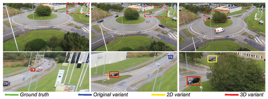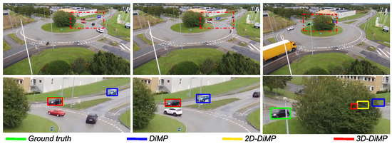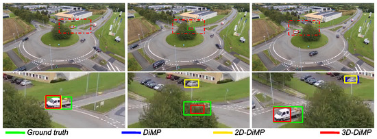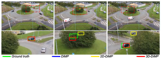 Figure 16 and Figure 17 display scenarios where the object is lost by the original DiMP variant in contrast to DiMP-2D and DiMP-3D. In the first scenario, the original variant, which uses a maximum-likelihood approach, misinterprets the distractor with the object because of the low number of pixels encoding the object. In contrast, by leveraging a particle filter, DiMP-2D and DiMP-3D handle the presence of distractors better and are less prone to fail on small-scale objects. The second scenario presents an occlusion situation, where the object is hidden by the tree in the roundabout. Both DiMP-2D and DiMP-3D recognize occlusion and can rely on their respective particle filter for predicting the position of the hidden object, until its reappearance.