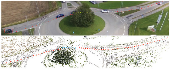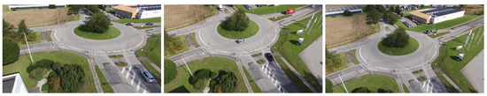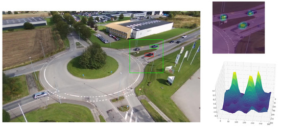 These tracking algorithms are tailored to scenarios presenting ground-level perspectives, but onboard UAV perspectives present particular challenges. For instance, the object occupies a relatively small portion of the image space, resulting in a less-accurate learned appearance model. This leads to lower discrimination capabilities when similar objects to the tracked object are encountered. In particular, tracking an object with an oblique view on the scene from a UAV can present multiple occlusion situations compared to a top-down view. To analyze the performances of tracking algorithms in UAV scenarios, several benchmarks have been introduced [3,29,30,31], ranging from low to high altitudes, and propose either an oblique view from the UAV or a top-down view. Most participating trackers in the SOT UAV benchmarks use state-of-the-art single visual object trackers presented in ground-level perspective benchmarks without or only with minor adaptations. However, none of the adapted trackers participating in the SOT UAV benchmarks attempt to utilize 3D information. This can be explained by the lack of such information being provided in the datasets. In contrast, the AU-AIR dataset [32] introduced recently is oriented toward object detection from a UAV viewpoint. It offers sequences that capture typical traffic on a roundabout, as would a surveillance drone for traffic monitoring, and contains sequences that are suitable for reconstructing the observed scene in 3D—sufficient translation movements, not flying around excessively, and enough structures in the environment.