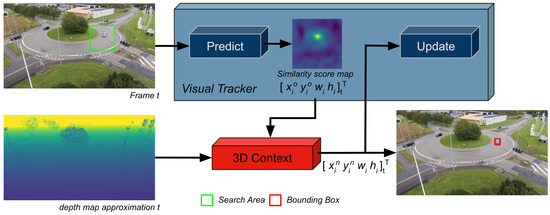 The architecture of the proposed single visual object tracking framework. The visual tracker outputs a similarity score map inferred in the search area. The similarity score map and depth map approximation corresponding to the image are processed by the 3D Context component, estimating a new position for the object in the image.