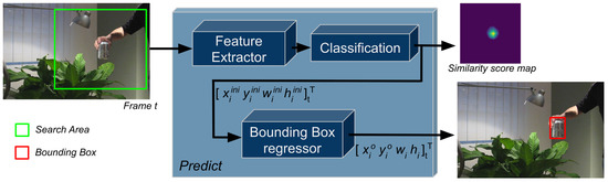 Block diagram of a visual object tracking pipeline—i.e., ATOM and DiMP—without the update step. During the tracking cycle, salient features from the search area are extracted through a feature extractor. Based on the extracted features, a similarity score map is inferred, used in estimating an initial bounding box of the object. Afterward, a refined bounding box is estimated trough the bounding box regressor, i.e., IoU-Net.