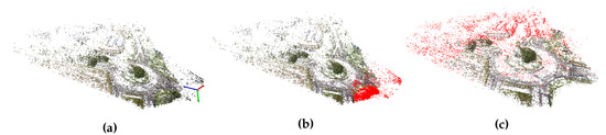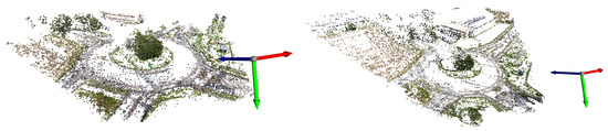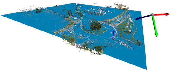 Figure 6a presents a point cloud reconstruction leveraged by COLMAP on an image sequence of AU-AIR-Track. The initial reconstruction of the scene contains noise near the camera frame and statistical outliers. Points near the camera frame are falsely triangulated and outliers are points correctly positioned but that are too sparse for reliably representing structures of the scene. To reduce the number of incorrect points in the reconstruction, we filter out points close to the camera frame and statistical outliers. We discard near-camera points from the point cloud by comparing their Euclidean distance with a threshold. For statistical outliers, we proceed as follows: (1) We define a neighborhood of 10 neighbors. The average distance of a given point i to its neighbors is calculated using the Euclidean distance. (2) A standard deviation threshold is defined and the overall average for all is computed as . Points with an average distance are identified as outliers and discarded from the point cloud. Figure 6b,c display the removal of points close to the camera frame and statistical outliers. Moreover, a plane ground is estimated by using the Random sample consensus (RANSAC) [60] method (see Figure 7). Points below the ground plane are discarded.