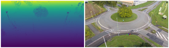 We compute depth map approximations based on the new scene reconstructed, i.e., the filtered point cloud with the estimated ground plane. The depth map approximations encode, for every pixel, the distance between the positions of the UAV and the visible points in the scene for the corresponding viewpoint, i.e., camera pose. For every frame in the AU-AIR-Track dataset, a corresponding depth map approximation is constructed by relying on the pinhole camera model; thus, enabling the mapping between the 2D image space and the 3D scene space. Figure 8 displays a depth map approximation example with the corresponding frame.