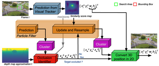 The occlusion identifier component identifies occluded particles composing the object cluster through the depth map approximation. To this end, we compare the depth value of the predicted particles from the perspective of the UAV and the depth value from the depth map approximation. We identify particles hidden by structures if there is a discrepancy between the predicted depth and the observed depth. We considered that if 50% of the particles from the object cluster are occluded, then the object is also occluded. Similarly, the object is automatically considered as hidden if the similarity score map is flat and widely spread over the search area. Should the object be identified as occluded, the tracking framework would rely on the predictions provided by the particle filter .