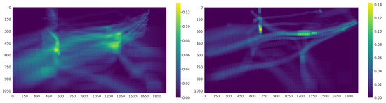 Figure 14 shows the distribution of the ground-truth bounding box locations for both sequences. The value of each pixel denotes the probability of a bounding box to cover that pixel over an entire sequence. It can be seen that most objects follow the underlying scene structure, i.e., the road. From the 63 possible objects present in sequence 0, 45 objects undergo an occlusion and 25 out of 27 objects in sequence 1. As stated before, AU-AIR-Track provides the 3D reconstructions of both sequences (see Figure 15). The 3D information available in our dataset are the sparse reconstructions with their respective ground plane estimations, camera poses, fundamental matrices, and transformation matrices.