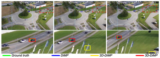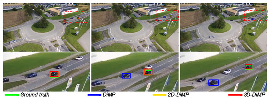 Based on Table 1, we observe that the original variations of ATOM and DiMP attain the lowest scores and the least stable results. As stated before, the original methods are designed for short-term tracking from a ground-level perspective by relying on visual cues. The original variants have no specific module integrated for handling partial or full occlusions apart from using a similarity score map with a threshold. If the similarity score map has no peaks (under a set threshold) and is widely spread, the tracker is able to recognize that the object is missing but is not able to predict the next position. The original variation is also more prone to switching the object with a false association—i.e., the distractor—because of the maximum-likelihood approach. Since the original trackers rely only on the learned appearance model, they are extremely dependent on the number of pixels that encode the object. This results in the tracker losing most of the tracked object when they are described with a low amount of pixels, i.e., small-scale objects.