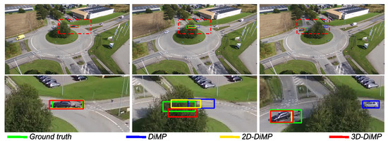 In this section, we discuss selected qualitative tracking scenarios to verify the overall viability of the different methods. To illustrate the results, an in-depth look is provided by examining the variants of DiMP. For every figure, a closer look at the scenario is shown on the lower part of the figure, based on a region delimited by a red dash–dot rectangle in the corresponding upper image.