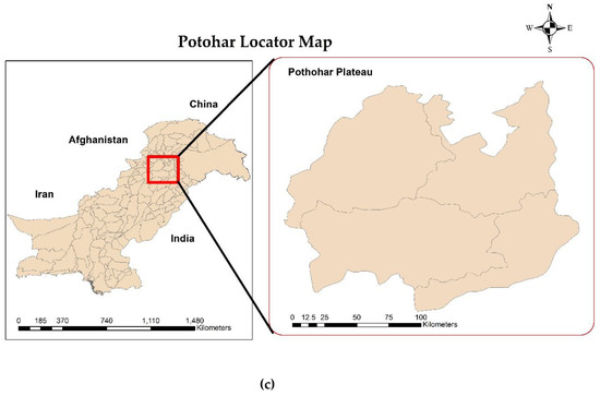 22]. The topography of the area shows local depressions, valleys, and ridges. Potohar stretches from latitude 32.166 to 34.150 N and longitude 71.166 to 73.916 E; it covers an area of approximately 23,000 km