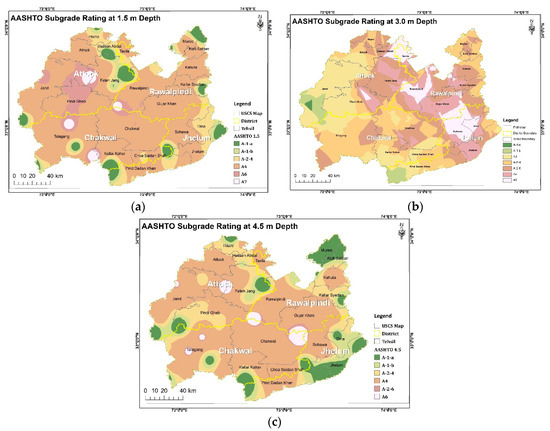 Geotechnical investigation is considered to be a pre-requisite for any civil engineering project. It ensures the safe execution of the project and improves its feasibility, planning, and design phases. There is an increasing challenge for geotechnical engineers to quantify ground properties by considering potential variability between the sampling points. To assess the variability of soil properties at a site, it is essential to consider the correlation structure of soil properties. This study was meant to be an aid by providing an electronic geodatabase and ready-to-use geotechnical map for an economical preliminary investigation. This approach may reduce the cost and time required for such investigations and provides reasonable accuracy. A comparable work has been carried out in the field of topography, digital elevation modeling, and agriculture soil mapping. Geological, crop health, and precipitation mapping are also of interest to the researchers. However, in the literature, there are no significant contributions to the appraisal of geotechnical mapping. Engineering soil classification is not only important for preliminary recommendations on the feasibility of proposed projects but also plays a vital role while selecting identified material sources for the proposed projects. The American Association of State Highways and Transportation Official (AASHTO) classifies soils on the basis of their relative suitability as a subgrade material, which ranges from excellent to poor (A-1–A-7, in descending order). This rating considerably affects the selection of routes and alignment of motorways and highways. In addition, subgrade rating greatly affects the cost of these megaprojects. Subgrade rating can even lead to the selection or rejection of a particular route for the proposed highway. In addition, it can identify potential problems on a specific route. The well-developed maps containing information on engineering classification and subgrade rating can serve as an excellent tool for engineering planers. The generation of such maps requires an extensive exposure to soil formation, geological processes, topographic features, field exploration, and laboratory testing along with a reliable data analysis, interpretive and mapping tools. Thus, a desk study was performed, which evaluated the available topographic, administrative, and precipitation data, location, and route of water bodies in the area.