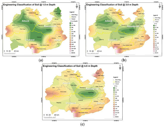 Figure 8. In addition, these maps show a diversified distribution of soil types. Fine-grained soils are dominant in the central part, while coarse-grained soils are prominent towards the edges at a shallower depth, i.e., 1.5 m. At 3.0-m depth, sandy soils overtake fine soils. Gravels are dominant at 4.5-m depth.