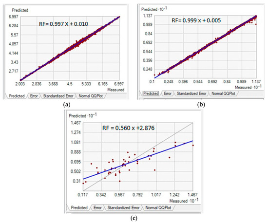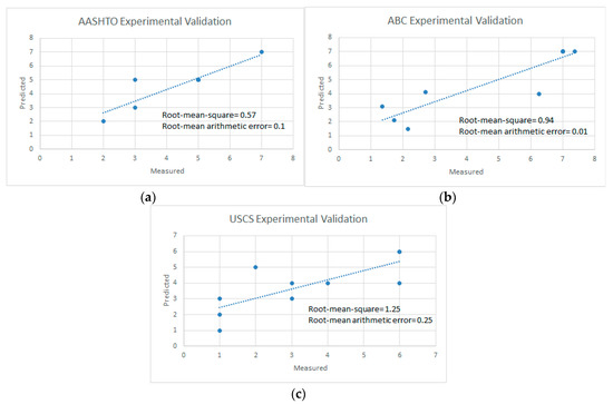 Figure 9. The average standard error for the measured and predicted values is determined as 0.145, 0.237, and 2.396 for AASHTO, bearing capacity, and Engineering Classification (USCS) maps, respectively. Root mean square was 0.031, 0.064, and 1.858 for AASHTO, bearing capacity, and USCS, respectively.
