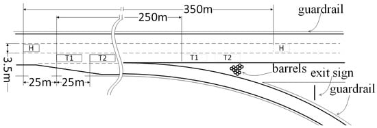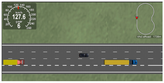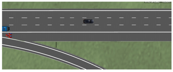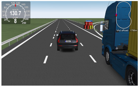 The experiment presented in this paper was performed using two test scenarios. Designed scenarios were chosen to represent highway situations to accurately represent intended-use cases of the perception system. Both scenarios were executed using the same virtual model (presented in Figure 1) of a straight section of the highway, bounded by guardrails on both sides, followed by an exit junction, with an exit sign and impact attenuating barrels. The test scenario models are shown in Figure 2 and Figure 3. Both scenarios assumed an approximately constant velocity of 126 km/h for the host vehicle along a straight line in the center lane. Scenario number 1 was executed with an empty road that did not contain any traffic participants except the host vehicle. Scenario number 2 contained one light and one heavy commercial vehicle in the right lane (Figure 4) moving with an approximately constant velocity of 90 km/h. In both scenarios, the host vehicle traveled 350 m over the duration of 10 s.