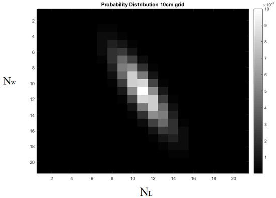 The ellipse obtained in these steps is used to select the cells of the grid lying inside of the ellipse in order to perform an update either by a lookup table with integration results or by numerically integrating the PDF of selected cell areas. The example of results numerical integration results is shown in Figure 9.