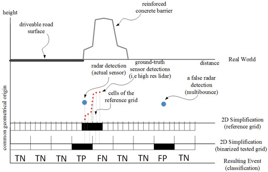 The process of performance assessment is explained by a 1D simplification where both the reference and the computed grids, which normally consist of rectangular cells, are represented by line segments with given values. In Figure 10, a 1D simplification of a process of ground-truth (reference) grid creation based on the perfect sensor is presented. The assumption for the reference data is that, anywhere on the reference grid where there was a registered detection (from the reference sensor) above the road surface level, the binary occupancy state of that cell is set to true. This process is performed for the complete length of the tested scenario to accumulate the information using reference positioning information of the perfect sensor.
