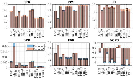 Colored bar plots of KPI results per scenario. TPR—True Positive Rate, PPV—Positive Predicted Value, F1 Score, FPR—False Positive Rate, FDR—False Detection Rate, NOMS—Normalized Occupancy Map Score.