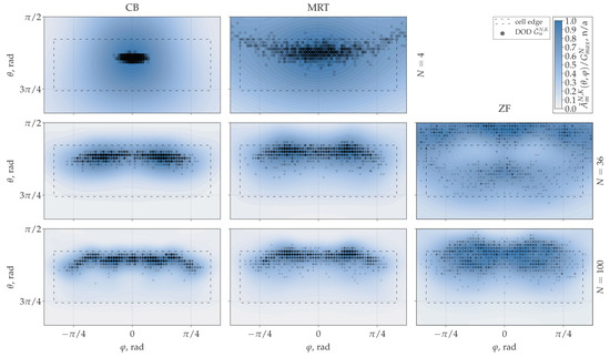 The center column of Figure 4 shows the DODs of the time-averaged gain found using MRT precoding. Similarly to CB, when the antenna count is low (, top-center plot), the maxima tend to be concentrated around the cell center. As N increases, tends to be directed towards the regions densely occupied with the UEs with higher probability. However, MRT shows an increased spread of the gain DOD compared to CB. This can be attributed to the fact that unlike CB, which assigns a single beam per active UE, MRT superimposes a set of multiple beams with powers proportional to the contributions of the corresponding propagation paths to the total signal received by the UE. If a UE has a direct propagation path to the BS (i.e., LOS), the instantaneous MRT pattern is likely to have a global maximum in that direction (second strongest path—the ground reflection, if present, being orders of magnitude weaker). In case the target UE resides in a shadow region (NLOS), several propagation paths typically contribute comparable amounts to the total received signal, e.g., if a UE is obstructed by a building, the main propagation mechanisms that make the connection possible are over-the-rooftop diffraction and reflections from the walls of the surrounding buildings. As a result, the time-average pattern maximum is sometimes found outside the cell boundary, as can be seen on the plots showing (center-center) and (bottom-center) in Figure 4.