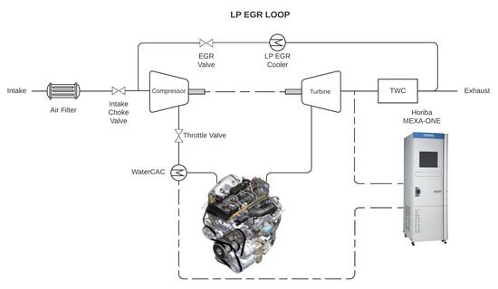 A prototype low-pressure (LP)-EGR line was added to the original engine, extracting the gases after a commercial three-way catalyst. The line consists of an EGR cooler, an EGR valve downstream this cooler, and an intake valve located upstream the compressor, which allows for greater EGR flows when the pressure difference between intake and exhaust lines is low.
