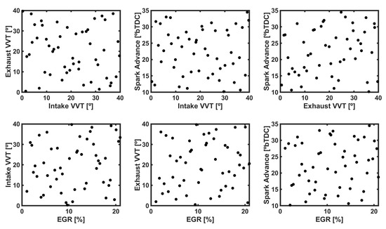 As stated in the introduction, the main objective of this study is to analyze the impact of different levels of EGR on the exhaust emissions of a turbocharged spark-ignition engine. However, these emissions will be affected not only by the EGR rate, but also by the spark timing (due to the impacts on combustion velocity and the temperature evolution inside the cylinder) and the VVT settings (since it controls the amount of internal residuals trapped inside the cylinder, especially at low loads). Therefore, in order to have a meaningful assessment of the exhaust emissions impact, it is necessary to have a proper combination of these calibration parameters as a function of the EGR rate. For this purpose, a design of experiments (DoE) was performed for six operating points, in a range from 1500 to 3000 revolutions per minute (rpm) and 6 to 15 bar of brake mean effective pressure (BMEP). This design of experiments was used to extract optimal calibrations at different levels of EGR, from zero to the maximum possible at each keypoint, aimed at optimizing the brake thermal efficiency. To successfully conduct the DoE, lower and upper boundaries had to be determined for each of the variables for every DoE. Intake and exhaust VVT boundaries were set according to safety limits to avoid contact between valves and the piston head. On the other hand, spark advance and EGR rate boundaries were set based on preliminary tests: at high loads, combinations of low EGR and advanced spark were excluded to avoid knocking combustion; at lower loads, combinations of high EGR and retarded spark actuation were also taken out to avoid excessive combustion instability and misfires. Finally, the throttle actuation or the VGT were used to establish the engine torque once the rest of the parameters were set. Table 2 shows the ranges covered for each keypoint, while Figure 2 shows an example of the configuration of the DoE for the engine point of 1500 rpm and 6 bar BMEP.