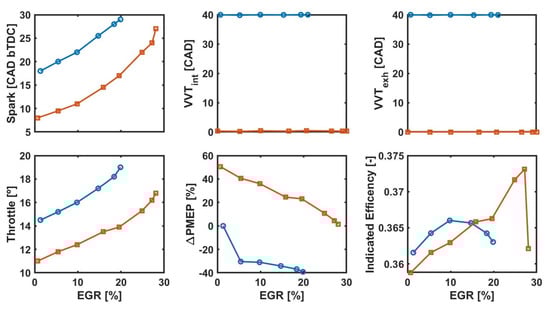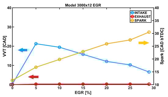 Figure 3 shows the calibration produced by the DoE methodology as a function of the EGR rate. As previously mentioned, VVT settings at 0–0 represent the minimum overlap condition, which is in this case the optimal before EGR is introduced. Instead, when EGR is introduced, the exhaust valve timing is maintained but the intake valve opening is anticipated. Additionally, the spark timing is severely anticipated as a consequence of two phenomena: the reduction of knock probability and the slower flame propagation characteristics.