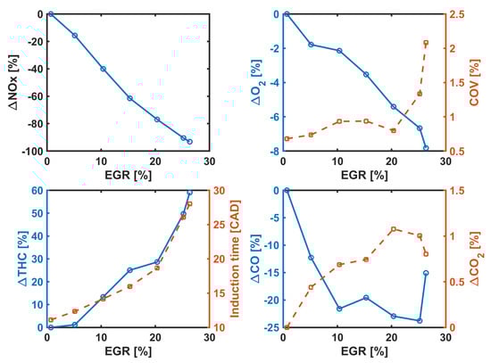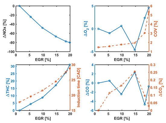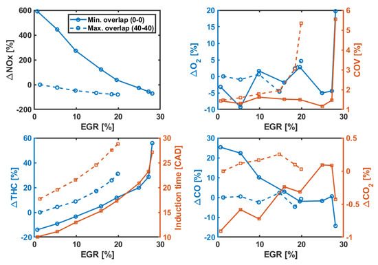 The results of the EGR variation for the maximum overlap condition in terms of emissions are depicted in Figure 8. The data are presented using the same organization as already described for the medium load operating point. Again, emissions (upper left chart) are directly driven by the lower temperature and oxygen content of the unburned zone inside the cylinder. Unburned hydrocarbon (lower left graph) results are mostly linked to the impact of EGR on flame propagation characteristics, as highlighted by the higher induction time. Regarding the oxygen content available in the exhaust gases, different results are achieved depending on the EGR range. Initially, up to EGR, the oxygen content was almost independent on the EGR rate, contrary to the continuous reduction seen in the medium load operating condition. This can be partially explained by the interaction with the internal residuals. While in the medium load conditions these residuals are not very significant and therefore the oxygen content is directly linked to the external EGR, in the case of the low load operation, the oxygen content is severely affected by these residuals. As previously seen, as the EGR rate increases, the amount of internal residuals is reduced due to the effect on the pressure differential across the engine, compensating the trend in terms of oxygen concentration in the unburned mixture. Therefore, it is not until the external EGR is increased up to that the decrease of the oxygen content can be observed. However, from this point on, there is a severe combustion stability deterioration, more critical than the one observed at higher load due to the combination of high internal residuals and external EGR, leading to a new increase of concentration. This evolution affects the CO- kinetics, summarized in the lower right plot of Figure 8.