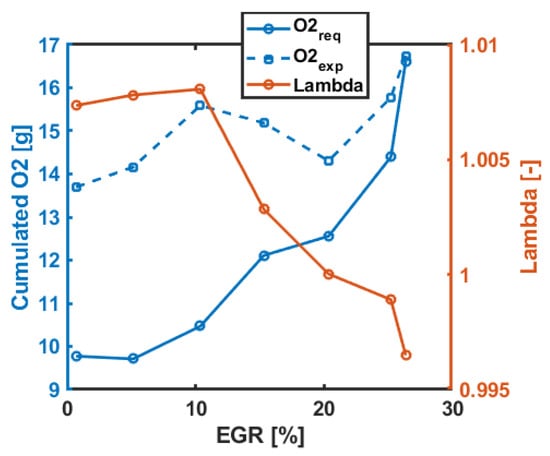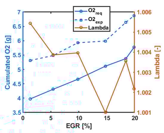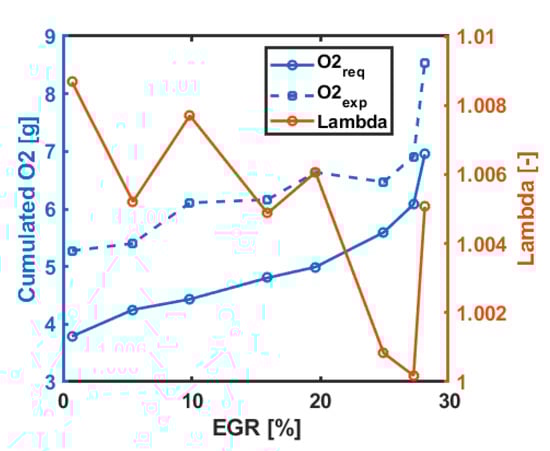 As a conclusion from the previous results, high external EGR operation induces exhaust gases with very low oxygen and while unburned hydrocarbons increase and CO decrease but to a lesser extent. These new conditions in terms of exhaust gas composition would induce difficulties to achieve a complete oxidation of HC and CO for a traditional three-way catalyst, such as the one present in the current experimental setup, which depends on for CO abatement. Therefore, analyzing the conversion efficiency in that catalyst would not provide a realistic assessment. Instead, a new catalyst design targeted for these new conditions should be proposed. With that in mind, the theoretical evaluation based on stoichiometric considerations presented in Section 2 was employed to analyze the potential capability of an ideal catalyst to achieve a complete oxidation of HC and CO. Figure 5 shows the result of the application of the catalyst stoichiometric model to the results previously seen. In this chart, the cumulative mass during the 60 s acquisition performed during the test is compared to the amount of oxygen that would be required to achieve a complete oxidation of HC and CO, according to Equation (4). Additionally, the value of lambda obtained from the experimental air and fuel mass flows is included. As it can be seen, at low EGR rates, the oxygen available is more than enough to produce complete oxidation of the emissions. However, as EGR increases, the increase in HC and the reduction of produce results in which the margin of oxygen available is reduced. In part, the fact that the oxygen content arriving at the catalyst is still enough to produce results in which full oxidation of the HC emissions is linked to the reduction of raw CO, which partially compensates the lack of oxygen. For the highest level of EGR, the CO tends to increase again, reaching a condition where the oxygen available is practically equal to the one theoretically necessary. Considering this result, a slightly lean condition is probably advisable for very high EGR rates, especially considering the significant reduction of engine out that can be achieved thanks to the addition of EGR. However, it has to be considered that, in this case, the low margin in exhaust oxygen is partially produced by the slightly rich lambda achieved in these conditions.