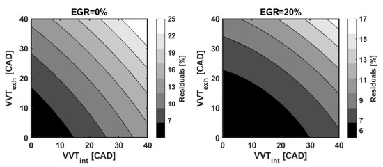 Residuals prediction as a function of variable valve timing system (VVT) settings for 1500 rpm and 6 bar BMEP. left: no EGR; right: 20% EGR.