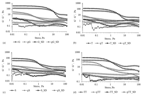 The evolution of the storage and loss moduli (G′ and G″) during the oscillatory stress sweep test for the suspensions and sourdoughs prepared with the wholemeal flours obtained by milling Gabriela (a), Trivale (b), Spelt (c) and Triticale (d) grains. Tests were performed on suspensions prepared using flours from raw (G, T, S and TT) or germinated grains (gG, gT, gS and gTT) and on corresponding sourdough samples (G_SD, T_SD, S_SD and TT_SD prepared out of G, T, S and TT flours and gG_SD, gT_SD, gS_SD and gTT_SD prepared out of gG, gT, gS and gTT flours). Full and open symbols are used for presenting the evolution of G′ and G″, respectively.