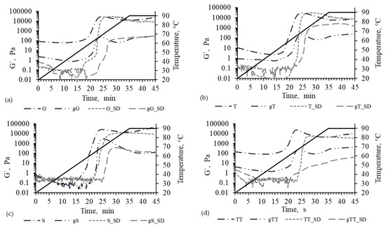 The evolution of the storage modulus of the suspensions and sourdoughs prepared with the wholemeal flours obtained by milling Gabriela (a), Trivale (b), Spelt (c) and Triticale (d) grains, during the temperature ramp test. Tests were performed on suspensions prepared using flours from raw (G, T, S and TT) or germinated grains (gG, gT, gS and gTT) and on corresponding sourdough samples (G_SD, T_SD, S_SD and TT_SD prepared out of G, T, S and TT flours, and gG_SD, gT_SD, gS_SD and gTT_SD prepared out of gG, gT, gS and gTT flours). The evolution of the temperature during the rheological test is represented with black full line.