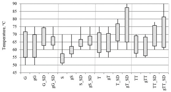 Temperature domains corresponding to the gelling process for the studied suspensions and sourdoughs during the temperature ramp test. The analysed temperature ranges corresponding to the inflection area of G′ vs. t curves are represented with lines, whereas the estimated gelling temperature domains are indicated as columns. Tests were performed on suspensions prepared using flours from raw (G, T, S and TT) or germinated grains (gG, gT, gS and gTT) and on corresponding sourdough samples (G_SD, T_SD, S_SD and TT_SD prepared out of G, T, S and TT flours, and gG_SD, gT_SD, gS_SD and gTT_SD prepared out of gG, gT, gS and gTT flours).