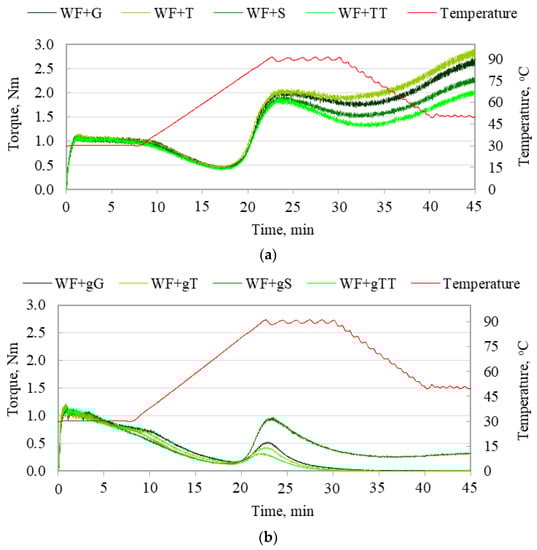 As shown in Table 2 and Figure 4, the use of gG, gT, gS and gTT flours resulted in changes of the pasting properties compared to the corresponding dough samples with raw G, T, S and TT flour (controls). It should be noted that addition of raw TT and S flour had a higher influence on pasting properties compared to G and T. The highest values of the maximum torque during heating (C3) were 1.99 and 2.20 Nm in case of the samples with raw G and T flour addition. Weaker starch gel stability (C4) was registered for dough samples with S and TT, most probably because of the high amylase activity in these samples, compared to G and T. Triticale and spelt tend to have higher α-amylase activity compared to wheat, depending on the cropping environment [28,29].
