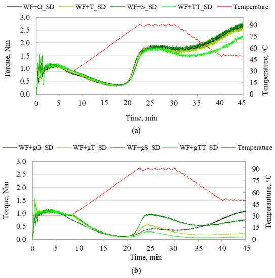 Mixolab curves of the white wheat flour (WF) supplemented with sourdoughs prepared with flours from (a) raw (G_SD, T_SD, S_SD and TT_SD) and (b) germinated grains (gG_SD, gT_SD, gS_SD and gTT_SD).