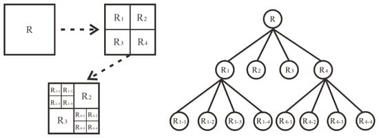 Figure 1 shows the decomposition diagram of the three-level quadtree model. The quadtree decomposition algorithm is used to subdivide the two-dimensional space into four regions by recursion. The first level decomposition divides the region R into four sub-blocks R1, R2, R3 and R4. In the second decomposition, the region consistency of each sub-block is judged in turn. If R2 and R3 meet the regional consistency standard, they are no longer decomposed while if R1 and R2 do not meet the regional consistency criteria, they continue to be decomposed into four sub-blocks, namely, R1–1, R1–2, R1–3, R1–4 and R4–1, R4–2, R4–3, R4–4.