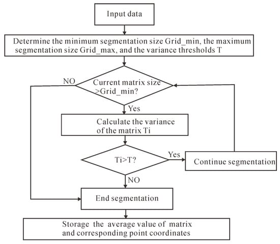 Figure 2 shows a flowchart of the adaptive quadtree decomposition for data compression. First, given the segmentation size and variance threshold, when the sub-block size is larger than the minimum size and the variance Ti is greater than the given variance threshold T, the segmentation is continued until all the sub-blocks meet the conditions. In this way, the data from different sub-blocks of various sizes are obtained, and the average value and the coordinates of the center point are calculated, and are then stored as a compressed matrix. The method of using the average value of all data points of a sub-block to replace all of the points in the whole sub-block is called the mean method. It is essentially a low-pass filter that filters out the high-frequency part of the data for de-noising.