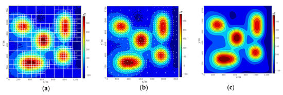To restore the distribution of magnetic field sources, the underground was divided into 64 × 64 × 20 grids, each with a length of 50 m. Firstly, the adaptive quadtree decomposition method was used to compress the magnetic data, and the variance threshold was set to 7800 (see Figure 9). The location map of the sampling points is shown in Figure 10. The black cross in the graph represents the position of the sampling data, with 1534 sampling points, accounting for 1.05% of the original data. The compressed data were used for 3D magnetic inversion, and the inversion results are shown in Figure 11.