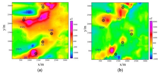 (a) Contour map of the original magnetic anomaly; (b) contour map of the local magnetic anomaly. The symbol with a cross in the circle indicates the location of the existing mining points.