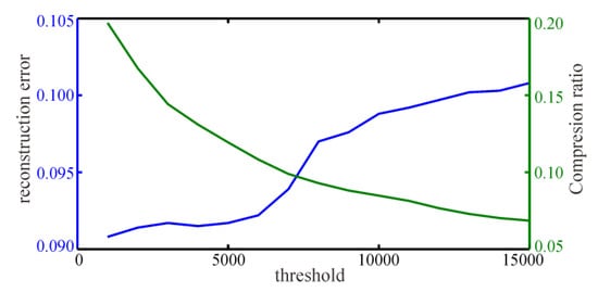 Reconstruction error and compression ratio change with a threshold. The intersection of the two lines was selected as the final threshold.