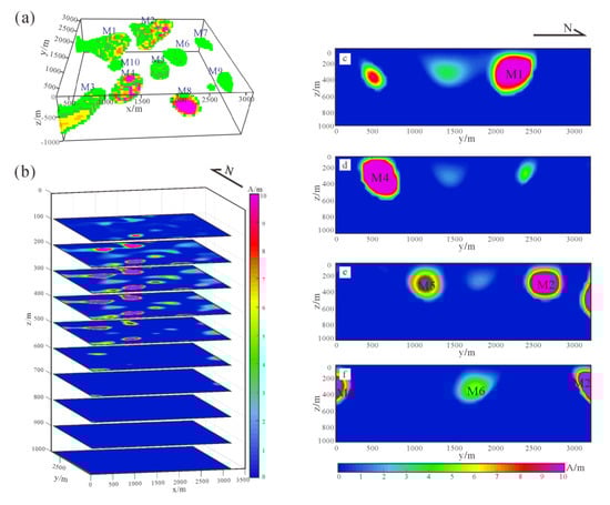 A total of 10 medium and high magnetization anomalies were obtained by 3D inversion, and were labeled M1-M10. The spatial location map is shown in Figure 11a. Figure 11b shows the inversion results at different depths. The distribution of anomalies corresponds to the surface magnetic anomalies, and their buried depth is between 100 m and 500 m. Figure 11c–f show the location characteristics of ore bodies at different sections. Combining existing geological data and inversion results, the M1 anomaly was located in the Xiang Shan (XS) pyrite area, which is a mined-out area above 100 m underground. The inversion results show that there are magnetite ore bodies under the mined-out area, inclined to the southeast with a deepest depth of 500 m. The M2 anomalous body is located in the south of the Nan Shan (NS) iron mining pit. A large number of diorite porphyrite, magnetite orebody, and pyrite ore body are exposed on the surface. It is speculated that the magnetite (mineralized) body exists underground at a buried depth of 200–400 m. Diorite porphyry and magnetite ore bodies are exposed on the surface where the M3 anomaly is located. Ao Shan (AS) iron ore is located near the southeast side. It is speculated that the anomaly is a magnetized ore body. M4 anomaly body is located on the north side of the AS iron ore pit. The exposed stratum is the Lower Cretaceous, and the residual magnetization is large. It is presumed to be a magnetized mineralized body. The buried depth is about 100 m, the thickness is about 400 m, and the width is more than 300 m. The M5 anomalous body is located in the Luo Bo Shan (LBS) mining area. The magnetite at the top of the location has been mined. There is magnetite in the deep rock body at a depth of more than 300 m, and the thickness is less than 100 m. The M8 anomaly shows obvious high magnetization, and it is speculated that there are magnetite ore bodies in the lower part. The anomalous bodies (M6, M7, M9, M10) in the northeast and southeast of the survey area have low magnetization and are presumed to be diorite porphyrite. Therefore, there are five magnetite bodies, M1, M2, M3, M4, and M8 in this area, which are large in scale and they have potential for development.