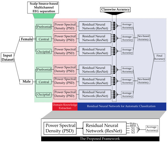 Figure 1 shows the block diagram of the proposed sleep stage classification framework. First, the power spectral density is calculated for individual channels of the EEG data for both the genders. After that, ResNet is trained using the PSD of individual channels as input, to identify different sleep stages based upon input from individual channels that is then combined in subsequent stages. The ResNet is individually trained to identify sleep stages in each gender, and its accuracy is also calculated individually for both genders.