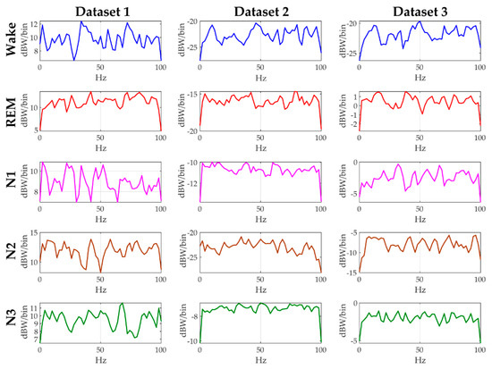 Sleep signals are continuous time series data with fluctuations in amplitude and behavior of different frequencies that changes over time for every sleep stage. The sheer volume of the highly fluctuating raw EEG data makes it challenging for machine learning algorithms to find a meaningful pattern that can be helpful in identifying different sleep stages. Hence, we calculate the Welch PSD of the raw EEG data to improve our chances of finding out a meaningful pattern that can be helpful in identifying different sleep stages [45,46,47,48]. The Welch PSD calculates the distribution of energy across different frequencies of the EEG signal. In Figure 2, the computed Welch PSD is plotted for the five different sleep stages of a female subject to show the differences among the PSD of different sleep stages. For calculating the PSD, the 30 s epoch is considered as an input. After that, DFT of 50% overlapping segment of nfft (number of points in DFT) is used (sampling frequency = 200 Hz, nfft = 100) to calculate the spectrum with DFT averaging. Therefore, the change in the amplitude is observed by converting the amplitude response from dBW/Hz to dBW/bin. For each dataset, the computed PSD response of each sleep state is different from the others, hence necessitating the use of three channel EEG data for sleep state identification.