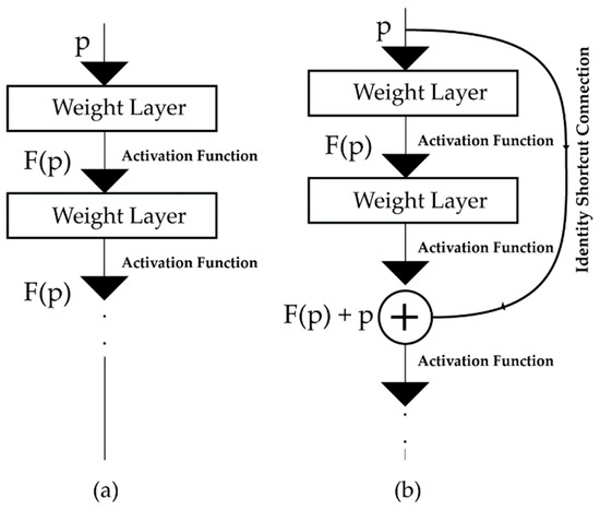 ResNet has emerged as a revolutionary idea in deep learning [28,29]. The main difference between a typical and a residual neural network is the residual connection, i.e., identity or shortcut connection, which makes a significant difference in architecture and performance [49]. Unlike traditional neural networks, where each layer feeds into the next layer (Figure 3a), in a residual neural network, each layer feeds not just into the next layer but also into the layers which are a few hops away [30] (Figure 3b). Thus, it helps to propagate larger gradients to the initial layers through backpropagation, thereby solving the vanishing gradient problem and enabling the training of deeper networks [30,50].