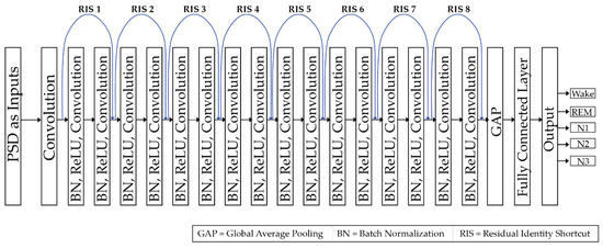 - A ResNet architecture, with eight identity shortcut connections, is used with the PSD of time domain EEG signals as input, to identify different sleep stages. The performance of the proposed framework is compared with eight different approaches and is found to be better.