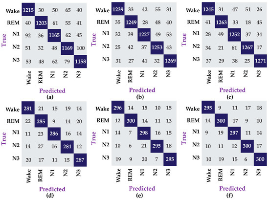 Confusion matrix for different datasets, i.e., (a) dataset 1, (b) dataset 2, (c) dataset 3, (d) dataset 4, (e) dataset 5, and (f) dataset 6.