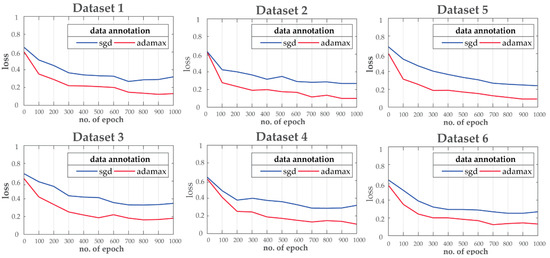 For the purpose of this experiment, the ResNet is trained for 1000 epochs with a 75/25 train/validation ratio to tackle the overfitting-underfitting problem. Moreover, during training, two different optimization techniques: i.e., stochastic gradient descent (SGD) and Adamax are considered for loss function optimization. Adamax shows better convergence (learning rate) for all the datasets compared to SGD as shown in Figure 6.