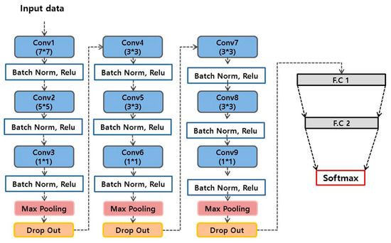 A DCNN model was utilized to implement the proposed personal visual-preference model, which is composed of three different types of layers: the convolution layer, the pooling layer, and the fully connected layer [6,20]. We mainly used [3 × 3] and [1 × 1] kernels, as used in VGGNet to construct a deeper neural network for improving classification performance [6,20]. Pooling layers are used as a means to reduce the computational cost by reducing the dimensions of the feature map and the number of parameters in the network [6,20]. Fully connected layers are used for the classification of feature maps generated in the final feature-extraction layer, which were composed of two hidden layers for sufficient classification performance [6,20]. In addition, we utilized a softmax function [6,21] as the activation function of the output layer, and the adaptive momentum (Adam) as an optimizer of the objective function to improve the classification performance [6,22]. Figure 1 shows the overall architecture of the proposed DCNN-based model for preference classification.