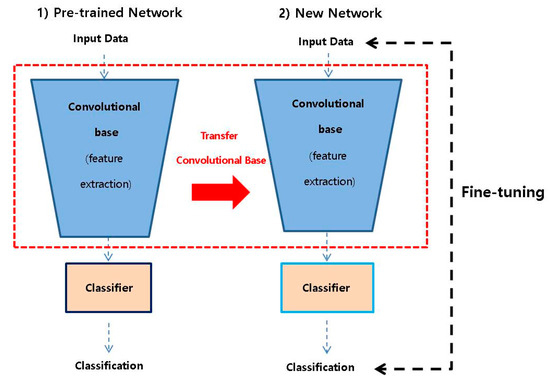 In order to mimic a human-like incremental learning mechanism, we considered transfer learning for incrementally training and inferring visual preferences in inter-domain images with atypical visual characteristics. In general, transfer learning can improve the classification performance by reusing a part of the pre-trained network for another domain dataset similar to the domain of the original dataset when the deep learning model does not have significant data to increase the classification performance [6,15]. Thus, we reused the feature extraction layers of the pre-trained network, connecting the pre-learned feature extraction layer with the newly defined classification layer to fine-tune all the parameters of the network [6], as shown in Figure 2.